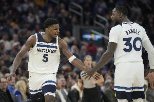 首节比赛,森林狼两大首发爱德华兹和兰德尔都有不错发挥,得分均已经上双,其中爱德华兹8中4,三分球3中2,罚球2中1,拿到11分2篮板1助攻的数据;兰德尔7中4,三分球3中2,拿到10分3篮板4助攻的数据。