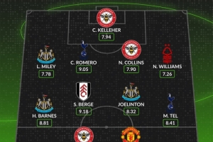 后卫:刘易斯·麦利(纽卡斯尔,7.78分)、C·罗梅罗(热刺,9.05分)、内森·科林斯(布伦特福德,7.90分)、内科·威廉姆斯(诺丁汉森林,7.26分)