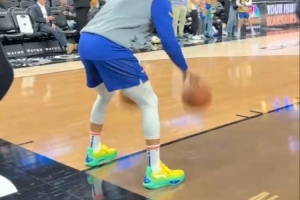 库里今天穿着巴特勒签名鞋JB3 Samba Dancer参加赛前训练