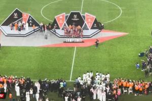现场完整视频显示,巴萨球员领取奖牌和捧杯时,皇马全队均在场上。阿劳霍举起奖杯时,皇马全队慢慢开始离场。
