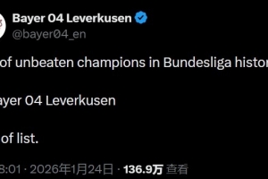 作为德甲历史上唯一一支不败夺冠的球队,勒沃库森官方在拜仁比赛结束后,更新社交媒体写道:“德甲历史上的不败冠军名单:1. 勒沃库森。名单结束。”