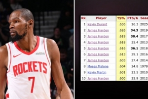 本场比赛过后,杜兰特场均26.3分,真实命中率63.6%,创火箭队史场均20+球员中真实命中率历史新高。