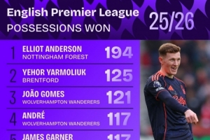 本赛季英超夺得球权次数排名: