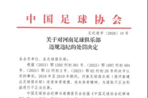 官方:河南俱乐部2018年至2019年进行不正当交易,扣6分罚款60万