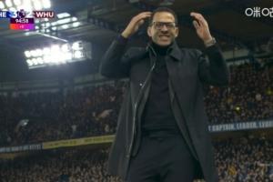 英超第24轮,切尔西3-2西汉姆联。比赛补时阶段,帕尔默攻门打出超级超级离谱冲天炮,罗塞尼尔抱头戴上痛苦面具。