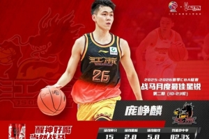【2025-2026赛季战马第2期月度最佳星锐球员——庞峥麟】恭喜江苏肯帝亚篮球俱乐部庞峥麟获得2025-2026赛季CBA联赛第2期“战马月度最佳星锐球员”!在常规赛10-23轮的比赛中,庞峥麟出战14场。在他场均出场的32分钟里,能够得到15分、2.8篮板、5.8助攻的数据,罚篮命中率82.3%。庞峥麟在本月度4次得到20+的单场得分,其中包含一场26分、8篮板、13助攻的“准三双”数据。