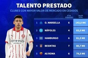 体育资讯2月10日讯 德国转会市场统计了各俱乐部租借加盟球员的身价,并列出榜单,马赛居首,那不勒斯、汉堡二三位。