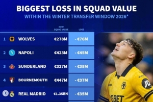 冬窗后身价下跌榜:狼队、那不勒斯、桑德兰前三,皇马、多特在列