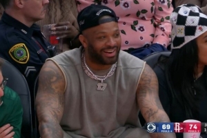 体育资讯2月11日讯 NBA常规赛,火箭102-95击败快船。此役前火箭球员PJ·塔克现场观战。