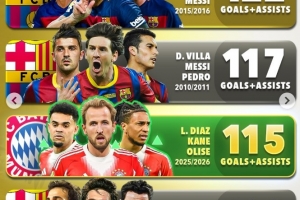 体育资讯2月13日讯 本赛季截至目前拜仁三叉戟凯恩、奥利塞以及迪亚斯共计直接参与115球(进球+助攻),在足坛历史三叉戟同期数据能够位列第三位,具体榜单如下: