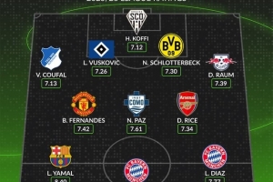 前锋:亚马尔(巴萨,8.40分)、凯恩(拜仁,8.27分)、迪亚斯(拜仁,7.77分)