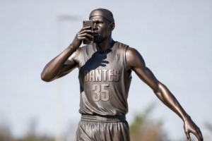 NBA Memes晒出了杜兰特的铜像(如新闻配图所示),并写道:“快讯:俄克拉荷马城雷霆计划在2026赛季结束时揭幕KD的铜像。”