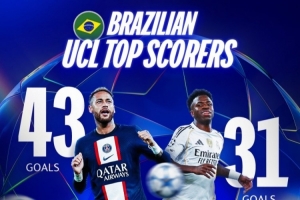 据欧冠官方统计,维尼修斯职业生涯至今在欧冠比赛中打进31球,超越卡卡(30球),巴西球员之中仅少于内马尔(43球)。