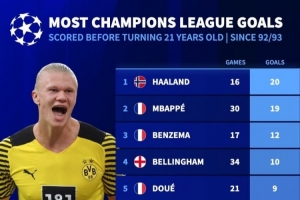 体育资讯2月18日讯 巴黎在本轮欧冠附加赛首回合3-2逆转摩纳哥,杜埃替补双响,数据统计显示他也是欧冠历史进球第5多的U21球员。