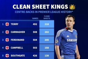 英超历史中卫零封榜:特里218场居首,卡拉格、费迪南德二三位