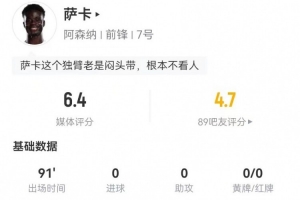 体育资讯2月23日讯 阿森纳在本轮英超对阵热刺,萨卡本场数据如下: