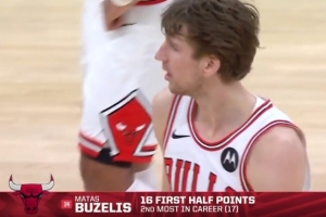 上半场比赛,公牛前锋布泽利斯扛起球队进攻大旗,进攻端里突外投效率不错,他出战18分钟,12中7,三分6中2拿到16分4篮板1抢断。