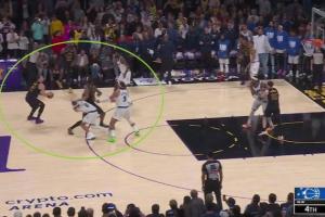 湖人最后一攻,艾顿为东契奇挡出了一片空地,但是东契奇犹豫错失机会,然后传给身前还有防守人的詹姆斯,詹姆斯极限接球转身三分,可惜绝杀不中。