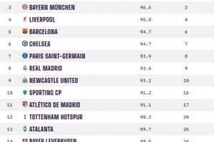 体育资讯2月27日讯 本赛季欧冠淘汰赛抽签结束,以下为数据网站OPTA对欧冠16强做的实力排名(括号内为全球排名)。
